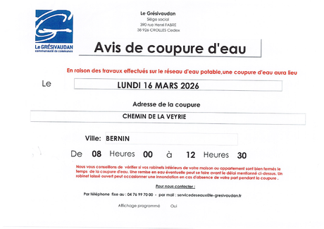 Coupure d'eau prévue le lundi 16 mars 2026 de 8h à 12h30 au Chemin de la Veyrie.